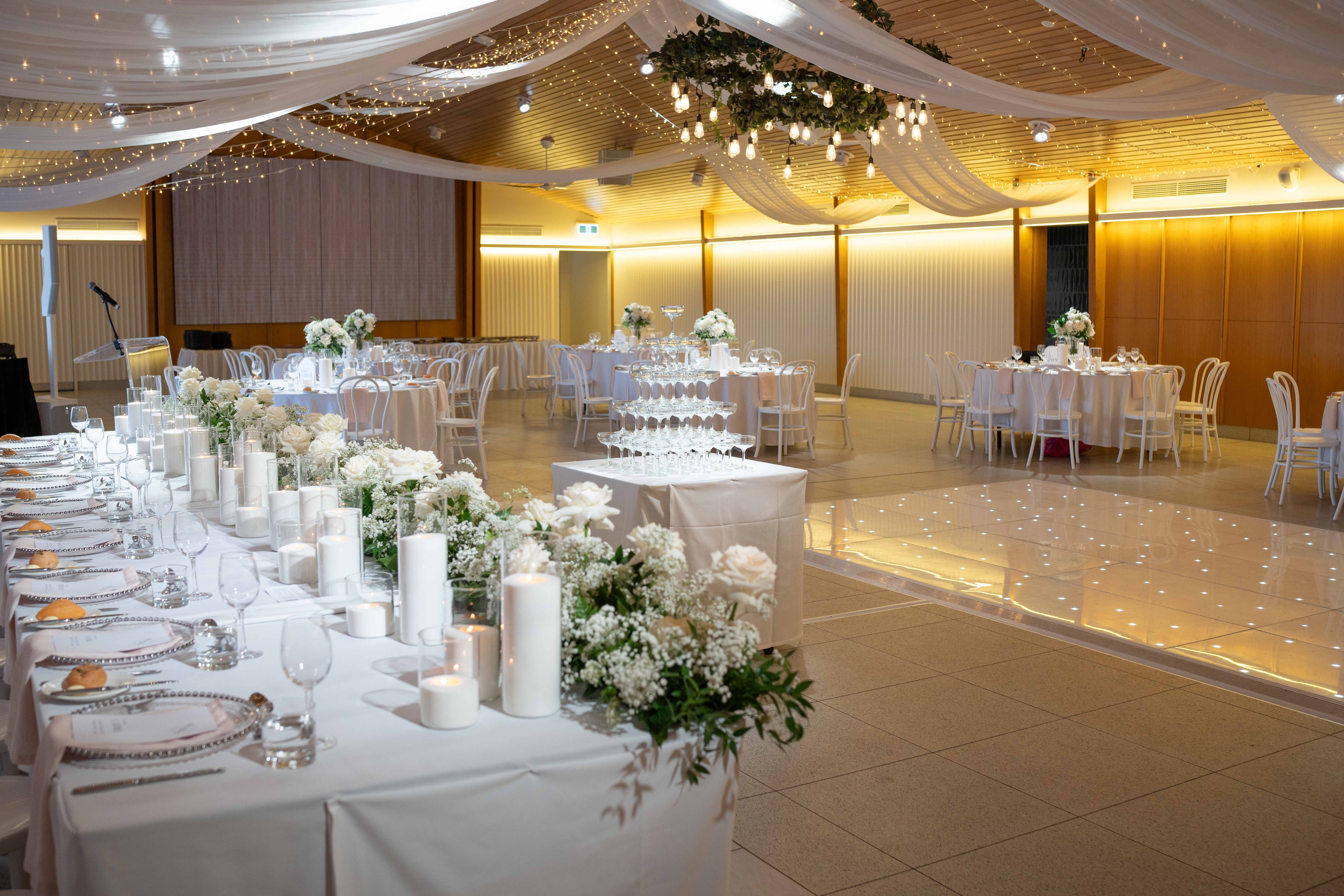 Transform your Beach Pavilion wedding into a dreamy, starlit celebration with 300 metres of fairy lights strung in elegant straight lines overhead, paired with flowing roof chiffon. This stunning combination creates a soft, romantic glow and adds graceful texture to your reception space, setting the perfect mood for an unforgettable evening under the lights.