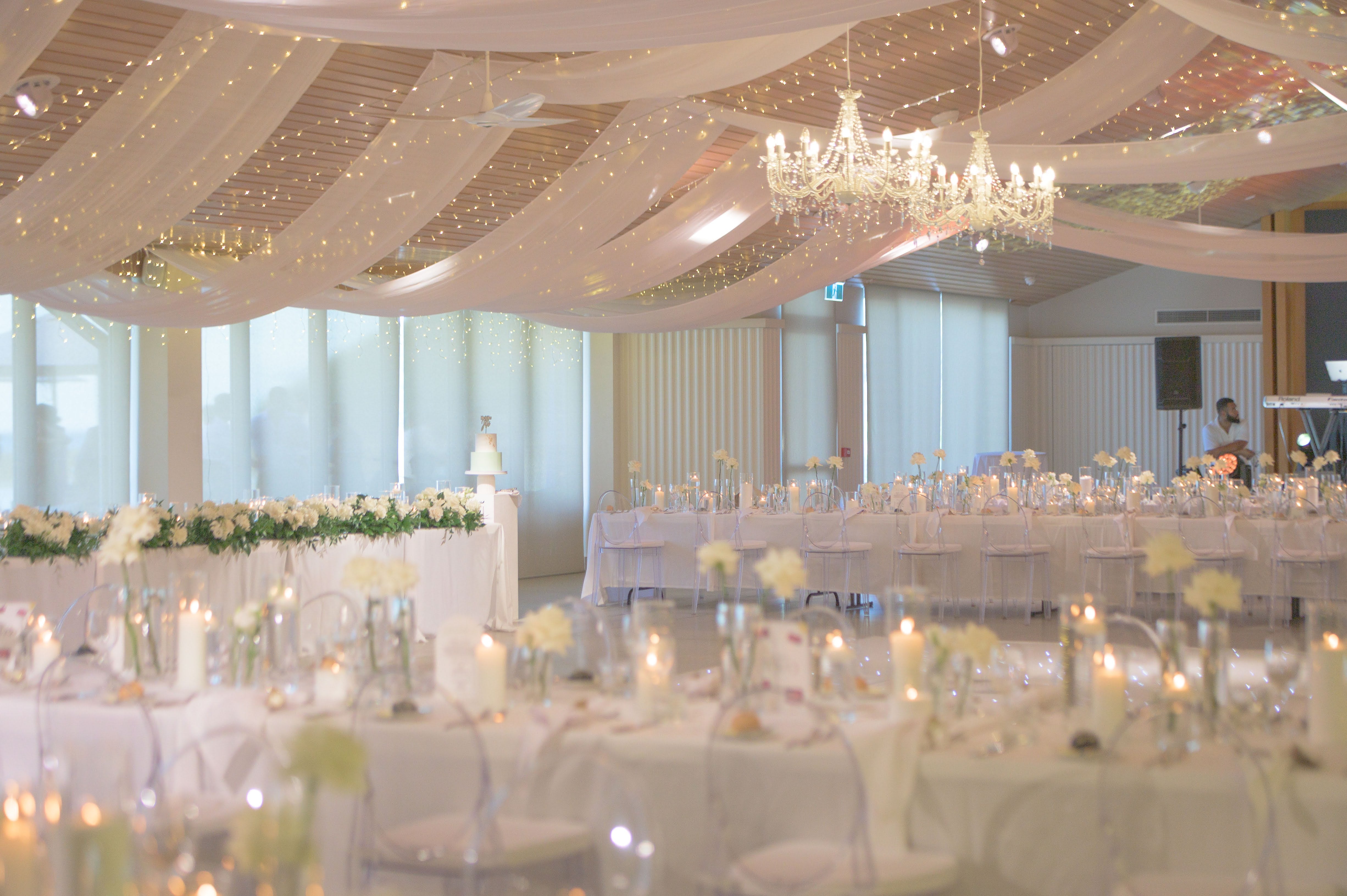 Transform your Beach Pavilion wedding into a breathtaking celebration with 500 metres of fairy lights arranged in elegant straight lines overhead, complemented by soft, flowing roof chiffon. This luxurious lighting setup bathes your reception in a warm, romantic glow, creating an unforgettable atmosphere for your special day under the stars.