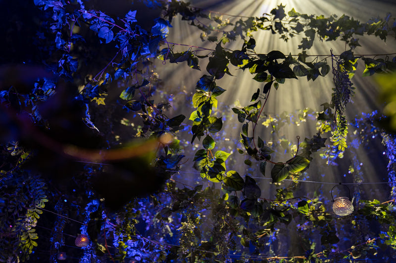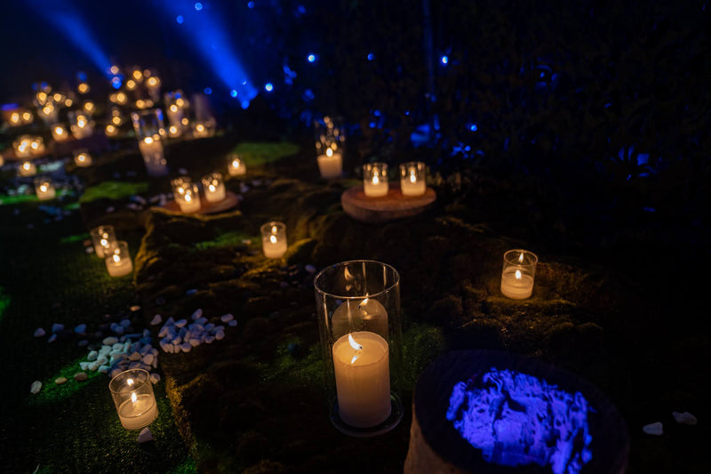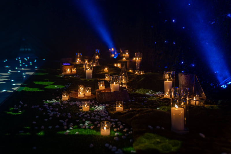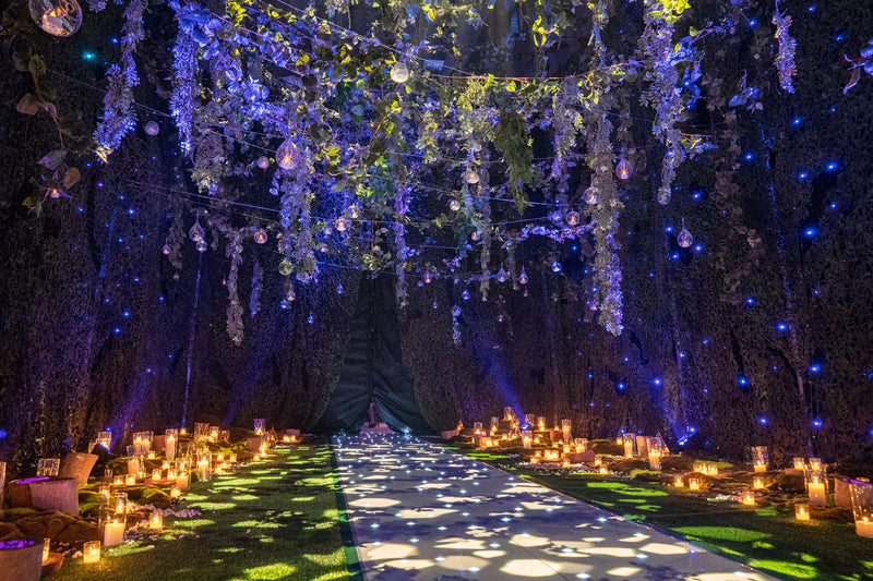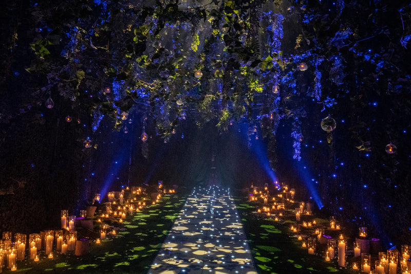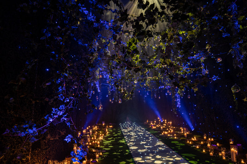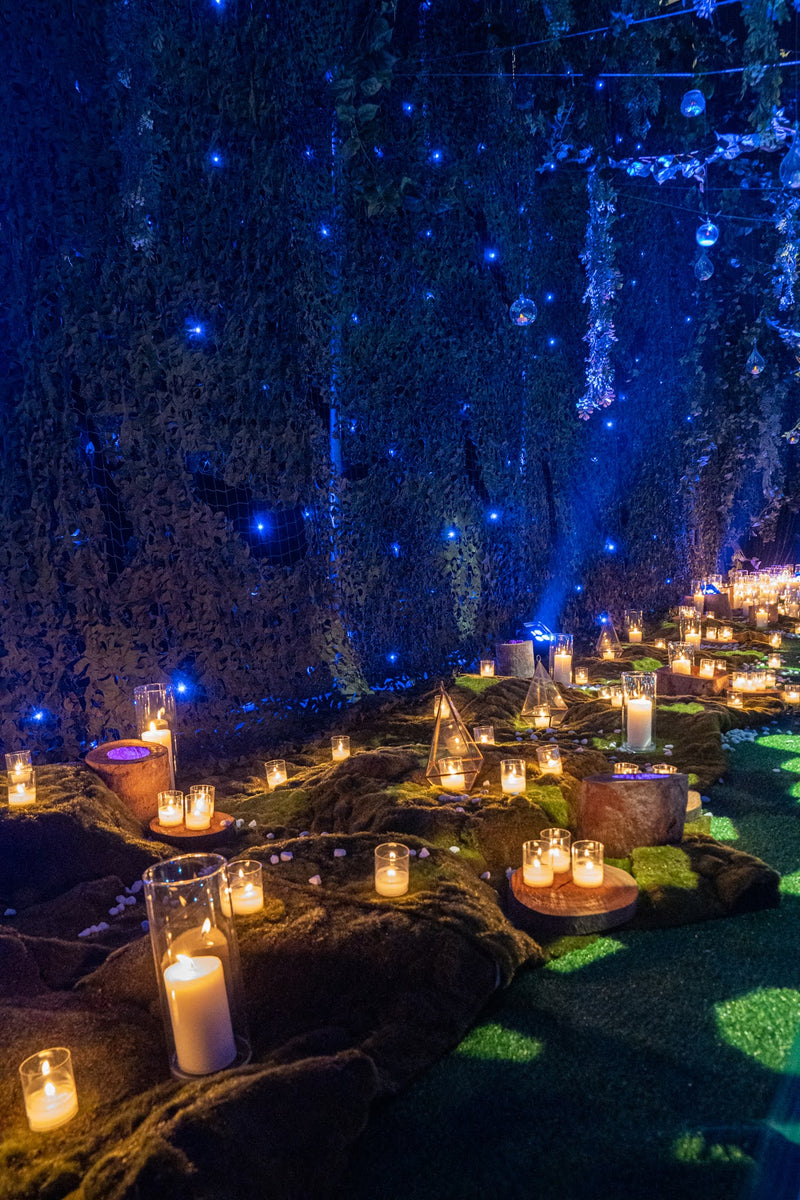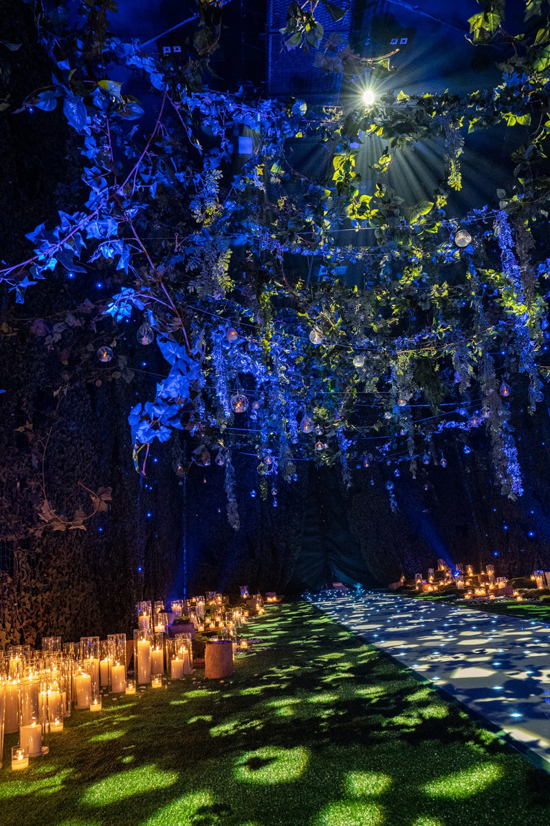 Guests will begin their journey through a dramatic entrance tunnel, softly lit with flickering candles and draped in cascading greenery, setting the tone for the extraordinary experience ahead. As they enter the main event space, they’ll be greeted by dark, moody walls that evoke the depths of an ancient forest, and beautifully styled tables adorned with forest-inspired details and natural textures.