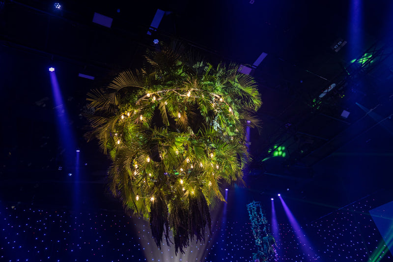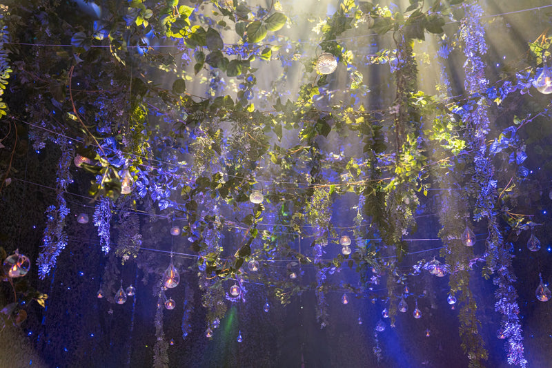 Suspended above it all, a breathtaking greenery chandelier becomes the focal point of the room—an awe-inspiring installation that brings the magic of the forest canopy indoors. Thoughtful touches throughout, from moss-covered accents to ambient woodland lighting, add layers of enchantment and sophistication.